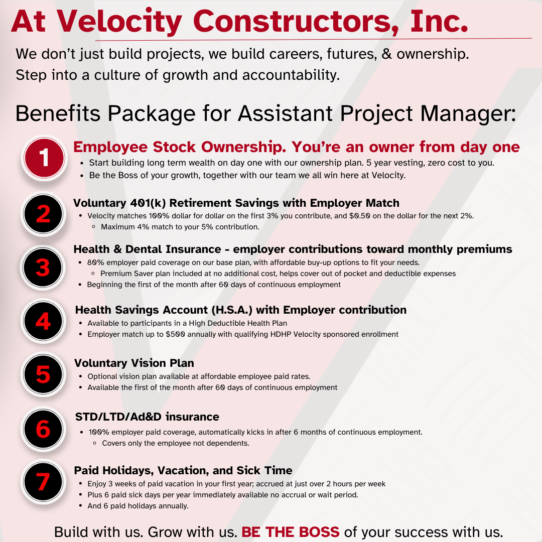 We are seeking an Assistant Project Manager (APM) to support the Project Manager and deliver projects from pre-construction through closeout. This role is designed for a motivated construction professional ready to take greater ownership of cost control, scheduling, subcontractor coordination, and contract administration.