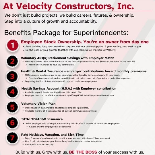 At Velocity Constructors, Inc. our top priority is integrity and compliance. We offer opportunities for both personal and professional growth. Encouragement to challenge the status quo and share knowledge throughout the organization. The Construction Superintendent provides on-site project supervision. Plans, directs, and coordinates all on-site activities for the project to ensure that the project is completed on time, within budget, injury free and of a quality that satisfies the Owner, engineer and Velocity Constructors, Inc. Keeps the end of the project as a primary focus. Stays proactive through the course of the project. Accurate, timely and effective communication with all project team members is essential.