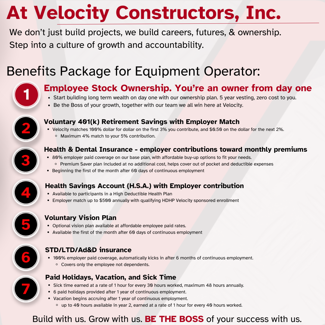 Velocity Constructors, Inc. is an employee-owned company that builds critical water and wastewater infrastructure. We expect integrity, accountability, and a strong work ethic from every member of our team. In return, we offer stable work, opportunities to grow, and the chance to build projects that matter alongside a skilled and motivated crew.